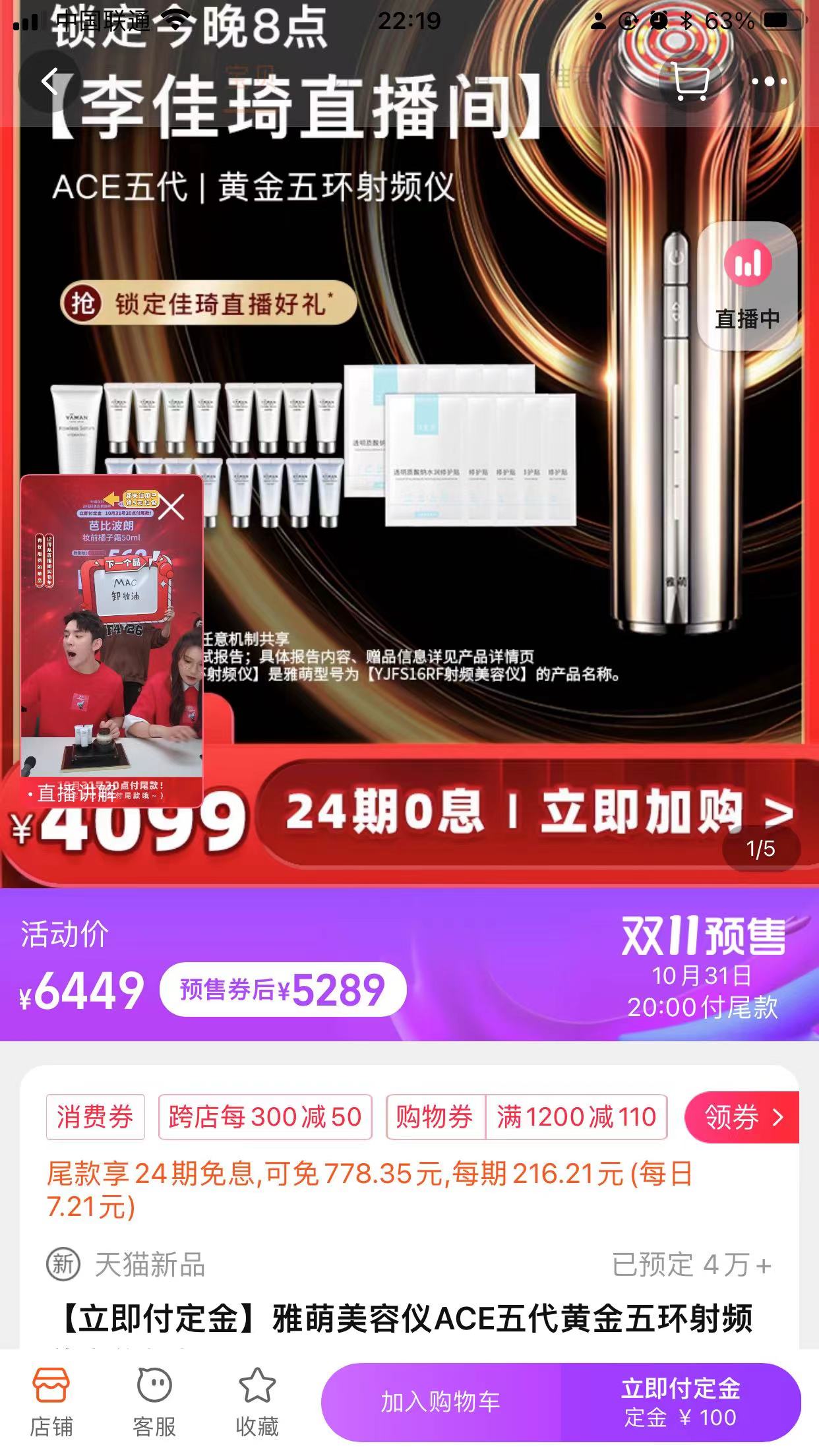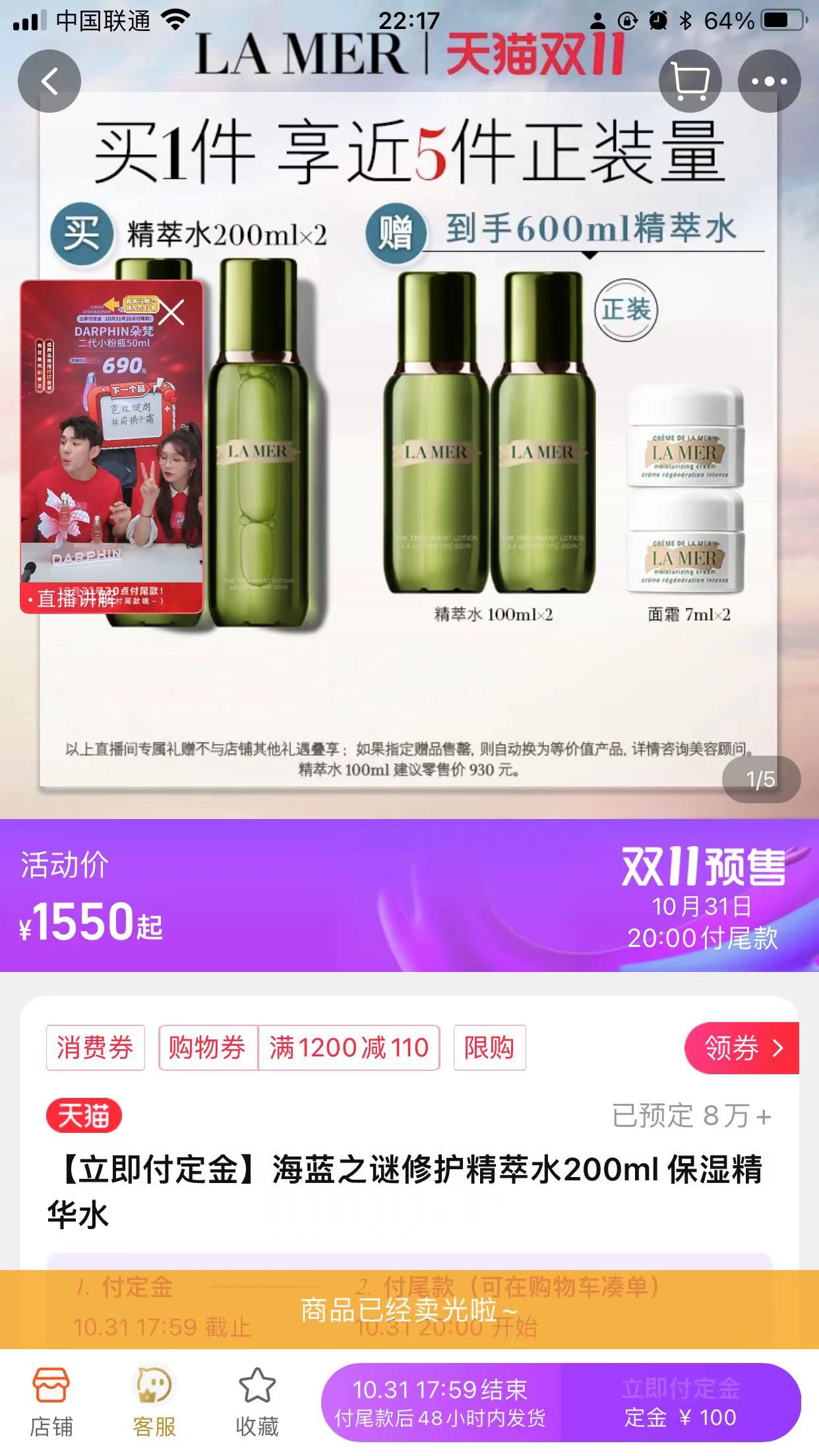 10月24日消息,在今日的李佳琦直播间中,售价1550元以上的海蓝之谜精粹水已售出8万件,售价4099元的雅萌美容仪已被预订超4万件,单链接预估销售额均超1亿元。