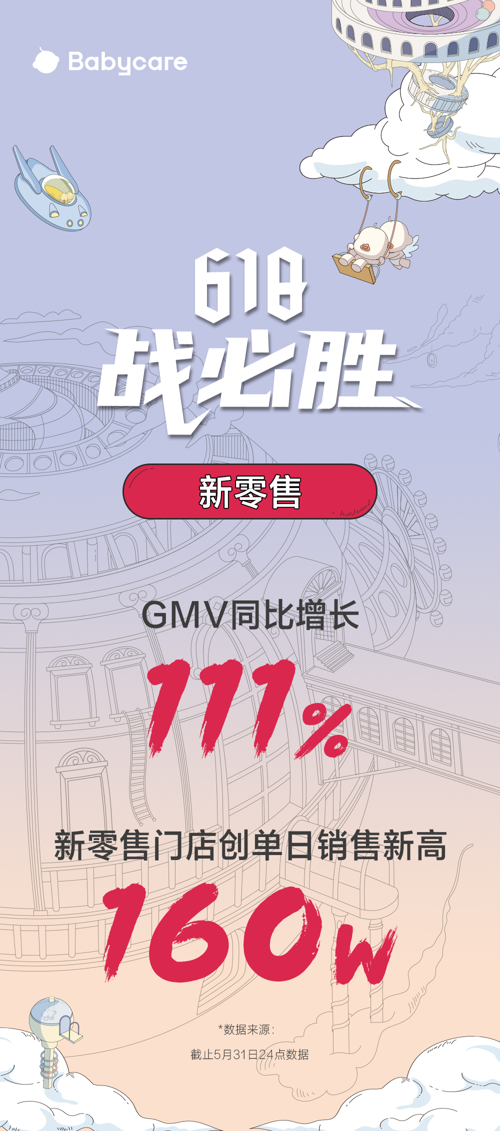 6月5日消息,刚刚,Babycare公布了618阶段性战报。截至5月31日24点,Babycare新零售门店(线下品牌门店)同比增长111%,新零售门店单日销售额突破160万。