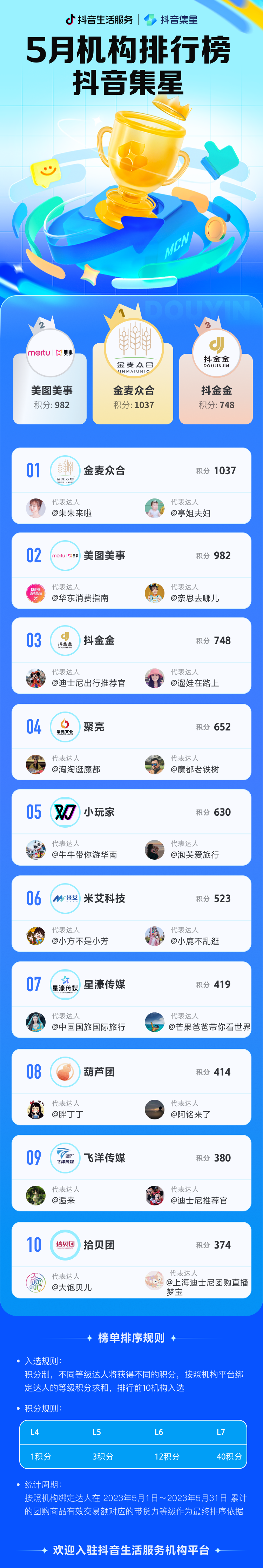 6月6日消息,抖音生活服务第五期“机构月度排行榜”已于今日正式发布,成功入驻抖音生活服务机构平台并缴纳保证金的机构通过孵化不同等级达人获得不同的积分,按照机构平台绑定达人的等级积分求和,排行前10机构入选本次榜单:金麦众合、美图美事、抖金金、聚亮、小玩家、米艾科技、星濠传媒、葫芦团、飞洋传媒、拾贝团。