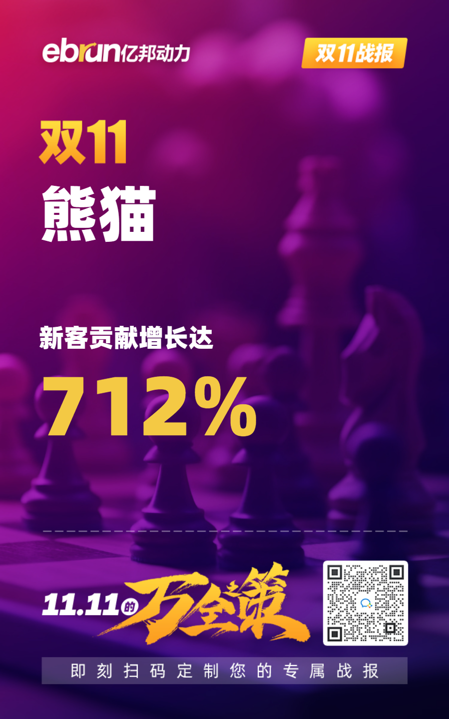 11月12日双11战报消息,潮服品牌熊猫双11新客贡献增长达712%。今年双11期间,潮服品牌熊猫的销售额在5分钟内即突破去年同期4.4倍,创熊猫天猫官方旗舰店单月销售额历史最高记录,同时,冲锋衣品类同比618增长800%。据悉,熊猫联动周洁琼JIE、陆翊CHANGE、陆思恒LOUIS等9位青年艺人共同分享推广品牌服饰及品牌文化。