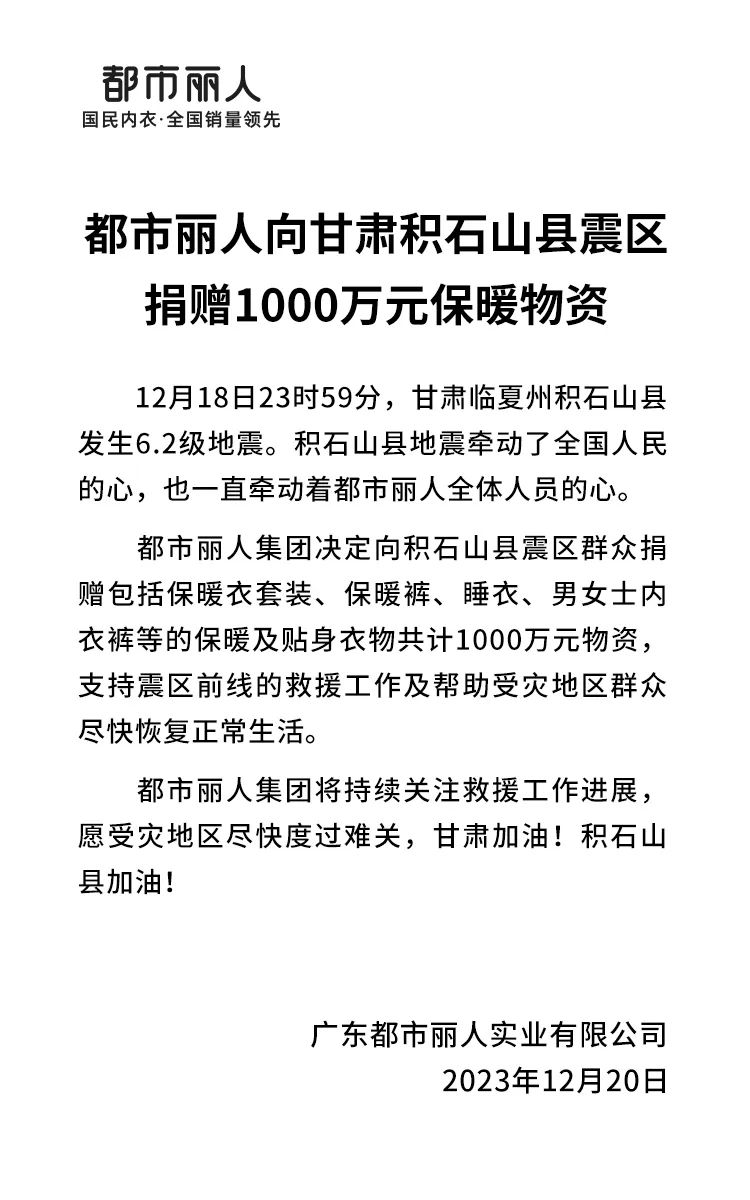 12月20日消息,甘肃临夏州积石山县发生6.2级地震后,都市丽人集团决定向积石山县震区群众捐赠包括保暖衣套装、保暖裤、睡衣、男女士内衣裤等的保暖及贴身衣物共计1000万元物资,支持震区前线的救援工作及帮助受灾地区群众尽快恢复正常生活。