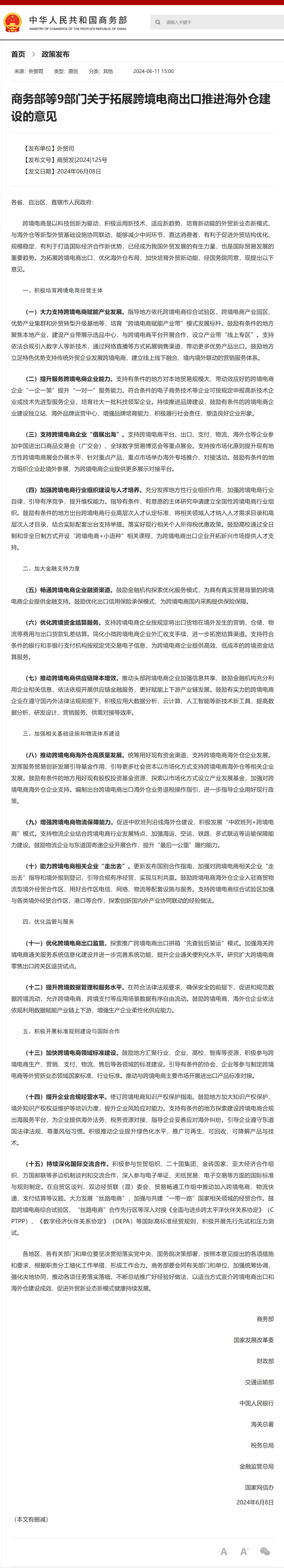 6月12日消息,日前,商务部等9部门各省、自治区、直辖市人民政府发布了关于拓展跨境电商出口推进海外仓建设的意见(以下简称“意见”),针对积极培育跨境电商经营主体、加大金融支持力度、加强相关基础设施和物流体系建设、优化监管与服务、积极开展标准规则建设与国际合作等五大方面提出具体意见。