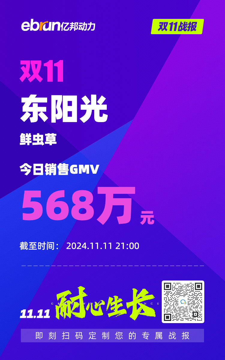 11月12日双11战报消息,东阳光鲜虫草今日上午9点到晚上9点,销售GMV达568万元