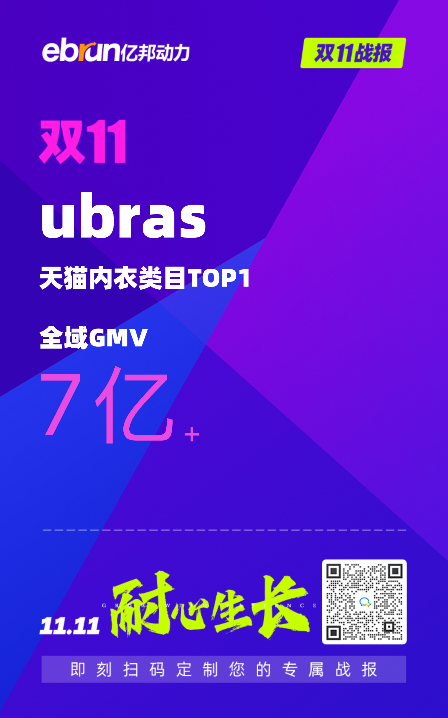 11月12日双11战报消息,ubras霸榜天猫内衣类目TOP1,全域GMV7亿+,实现天猫双11开售首小时破亿的新纪录。