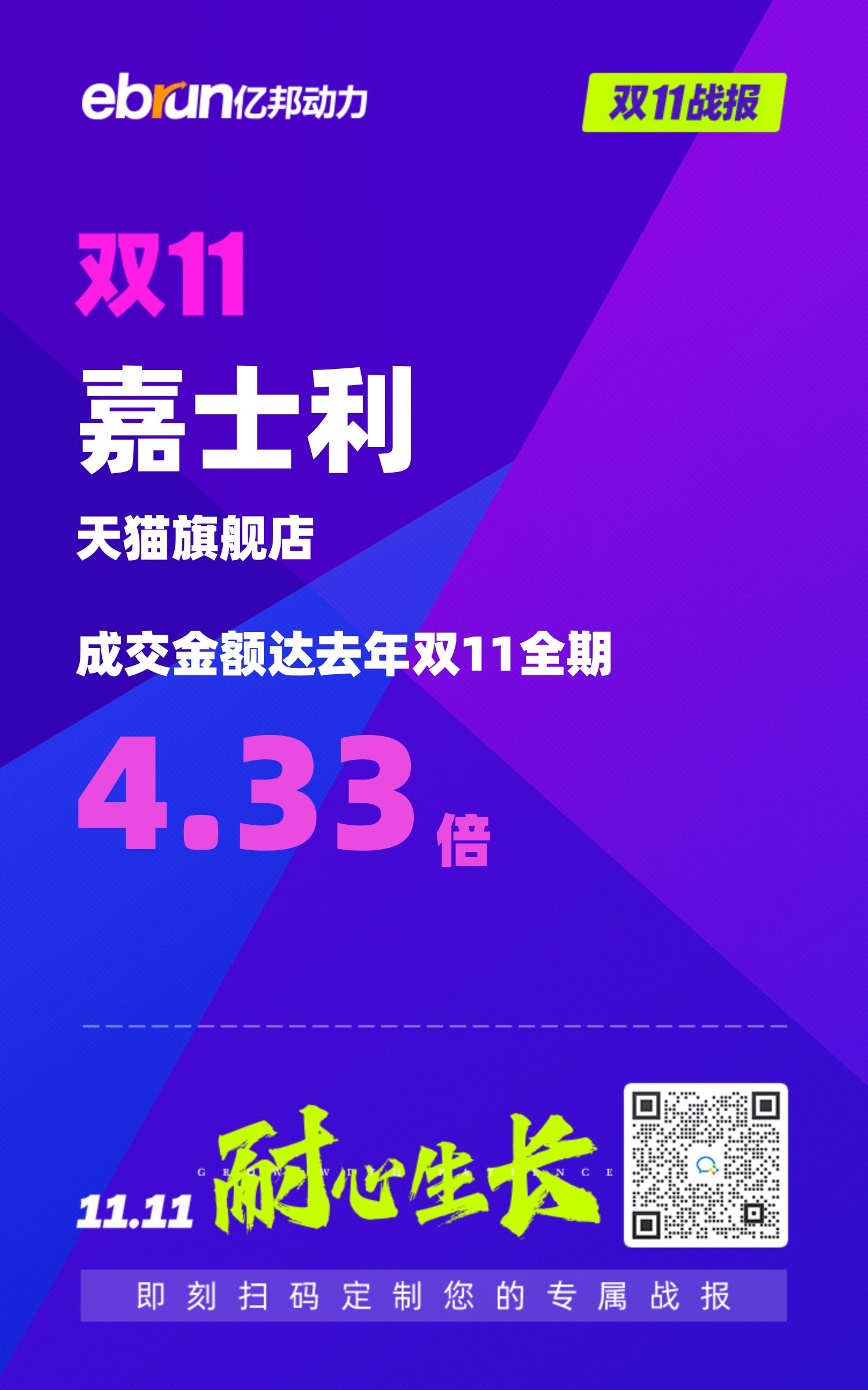 11月12日双11战报消息,嘉士利天猫旗舰店成交金额达去年双11全期4.33倍。