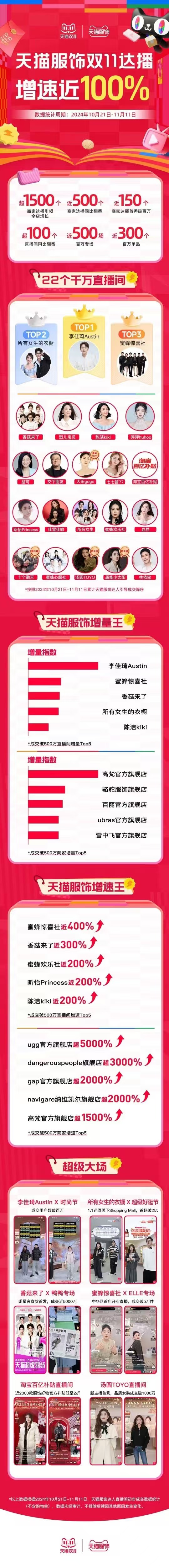 11月12日消息,天猫服饰公布了自10月21日至11月11日的达播战报。数据显示,这期间,天猫服饰双11达播增速近100%,近500个商家达播同比翻番;同时有近150个商家达播首秀破百万;超100个直播间的销售额同比翻番。同时间段内,天猫服饰完成了近500场百万专场直播。