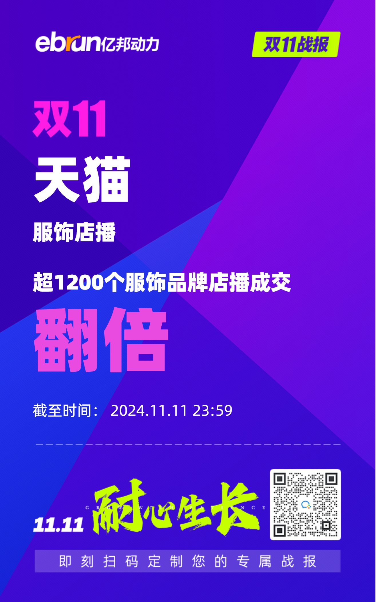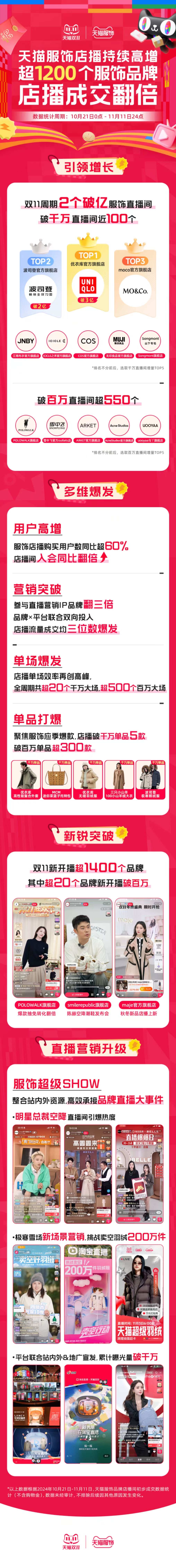 11月12日双11战报消息,截至2024年11月11日23时59分,天猫服饰店播超1200个服饰品牌店播成交翻倍。双11周期2个破亿服饰直播间,破千万直播间近100个,破百万直播间超550个。服饰店播购买用户数同比超60%,店播间入会同比翻倍。参与直播营销IP品牌翻三倍,品牌x平台联合双向投入,店播流量成交均三位数爆发。