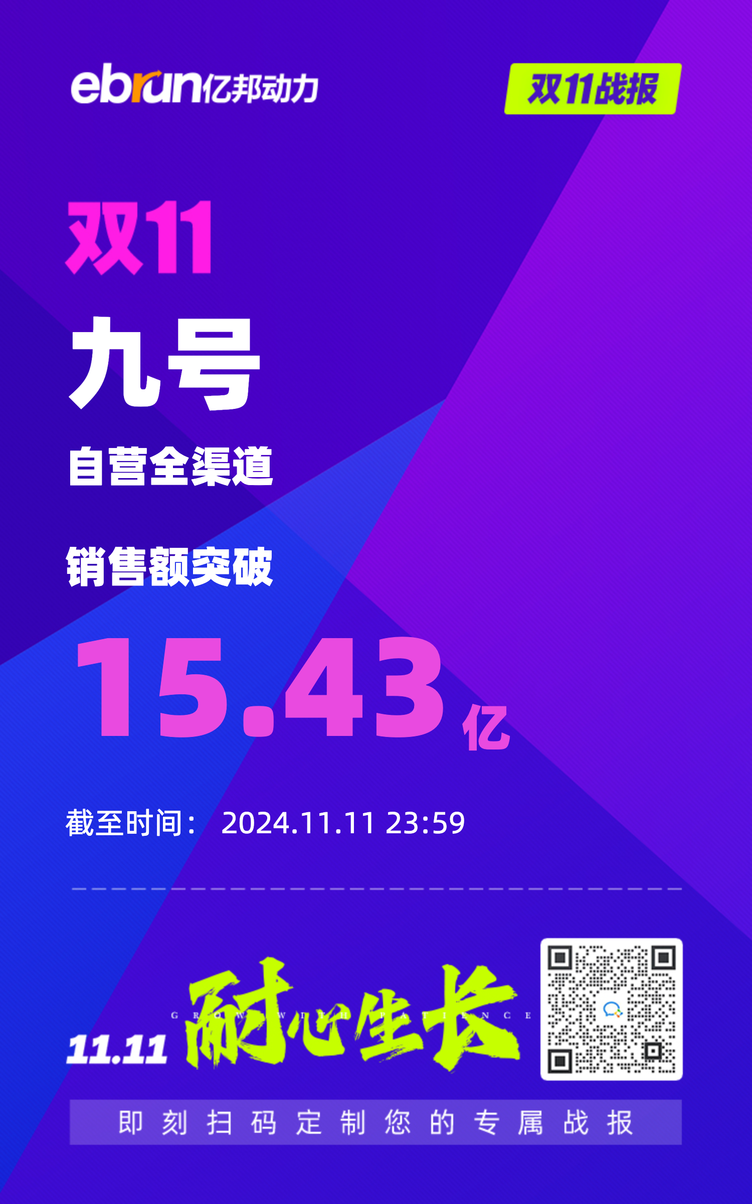11月12日双11战报消息,截至2024年11月11日23时59分,九号自营全渠道销售额突破15.43亿,同比增长61%。其中线上销售额破10.35亿,同比增长83%。是行业首个天猫直播间破亿品牌。快手电商直播首秀单日破1021万,为行业TOP1。