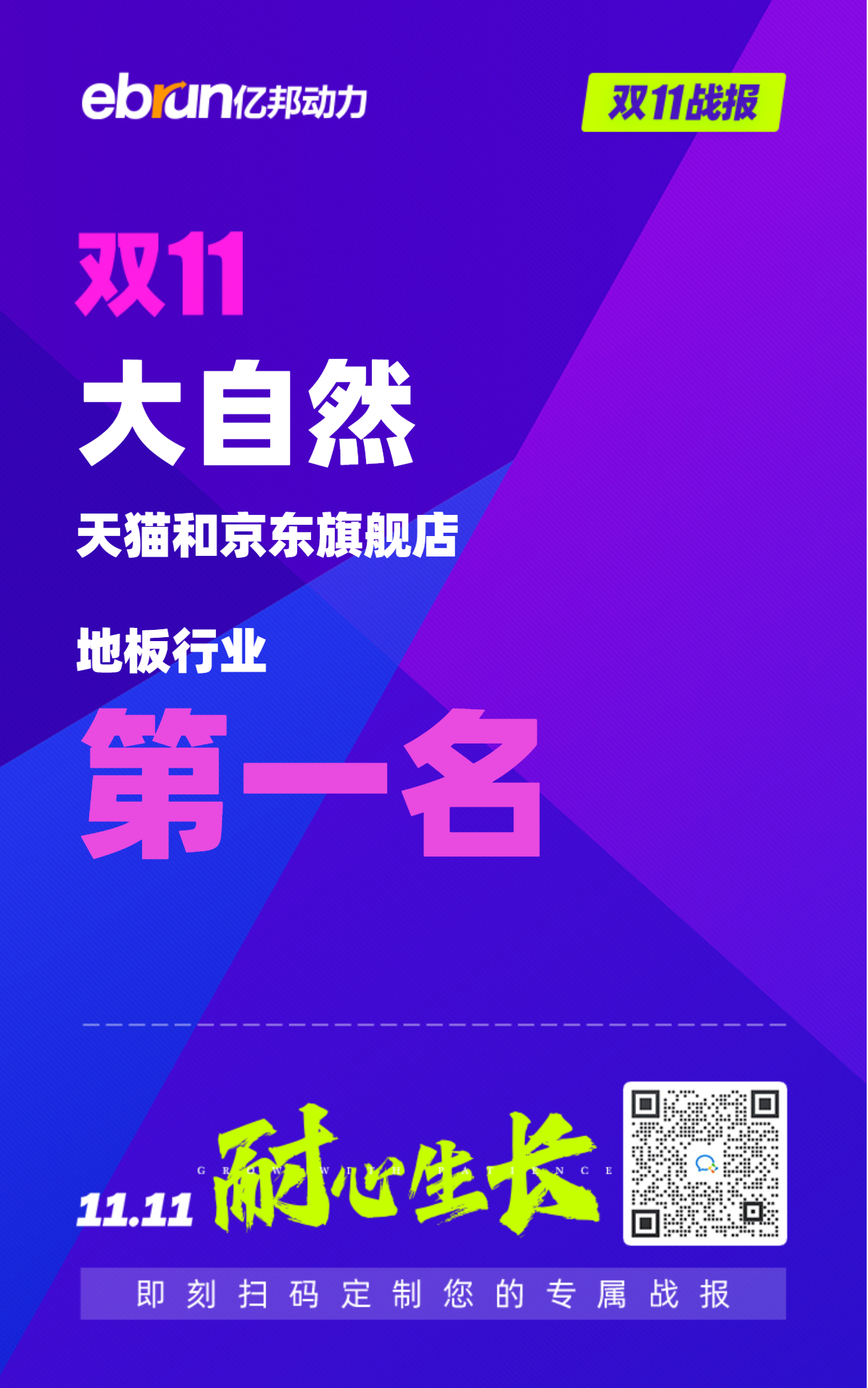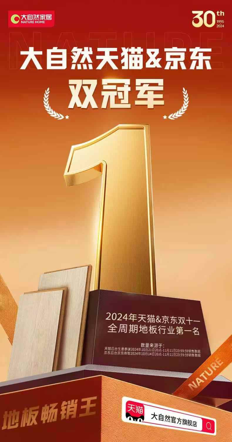 11月12日双11战报消息,大自然天猫和京东旗舰店地板行业第一名。