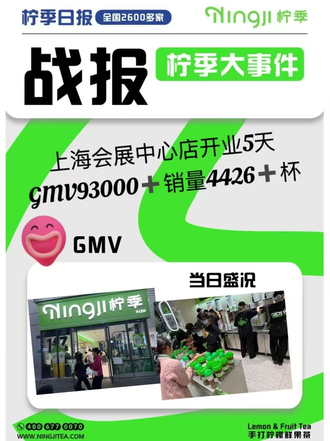 11月12日消息,柠季上海会展中心店开业5日,GMV超93000元,销量超4426杯。