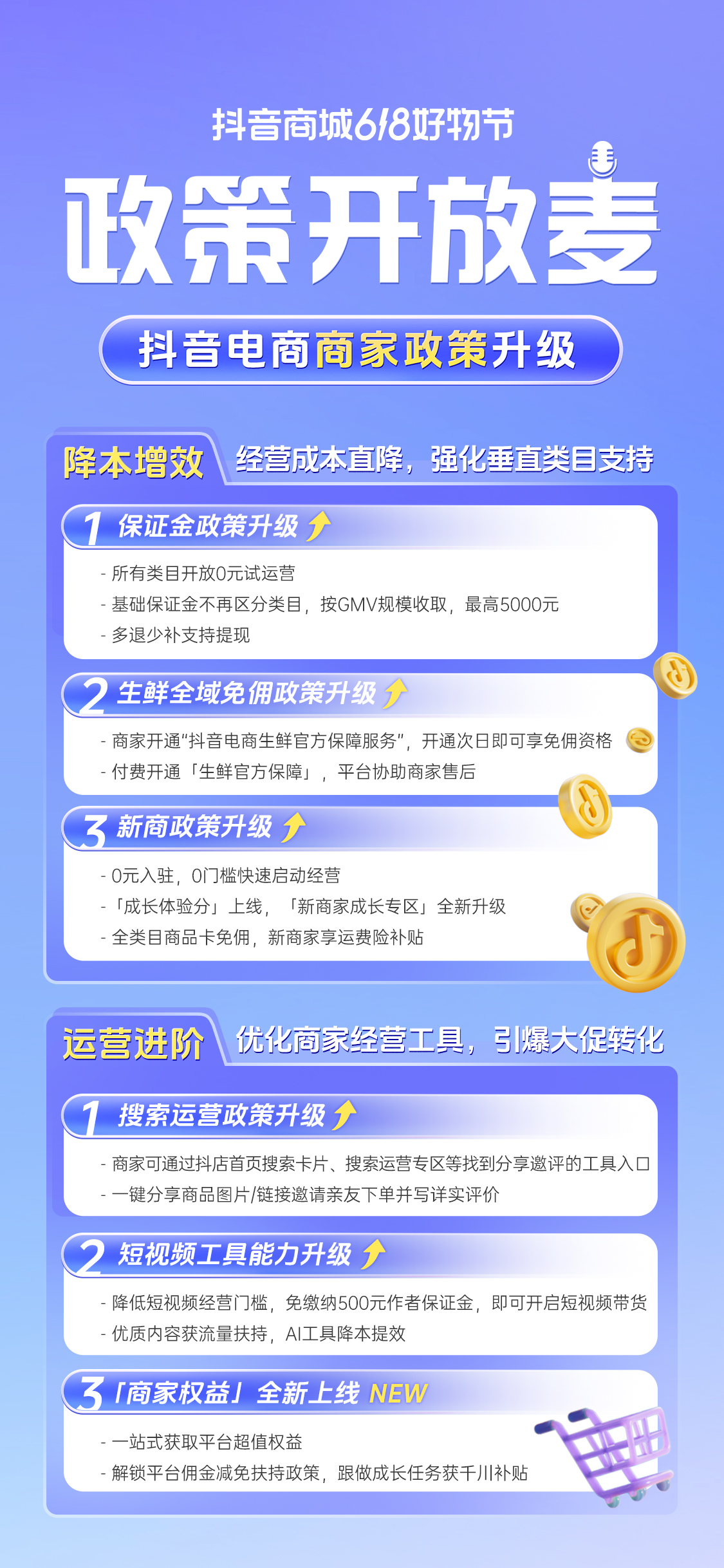 6月11日消息,日前,抖音电商通过“政策开放麦”解读升级商家政策,重点推出保证金政策新规:基础保证金缴纳标准大幅降低,全类目0元试运营,多退少补支持提现。此次升级将优化商家资金使用效率,预计惠及超百万商家,是平台优化经营环境的核心举措。针对新商政策持续加码,降低开店成本、专属流量扶持、经营成本补贴等多举措全方位支持新商成长。同时,平台还优化了搜索运营、短视频能力,对生鲜类目全域免佣。此次政策升级旨在帮助商家更好地把握618大促爆发期机遇,实现生意突破。