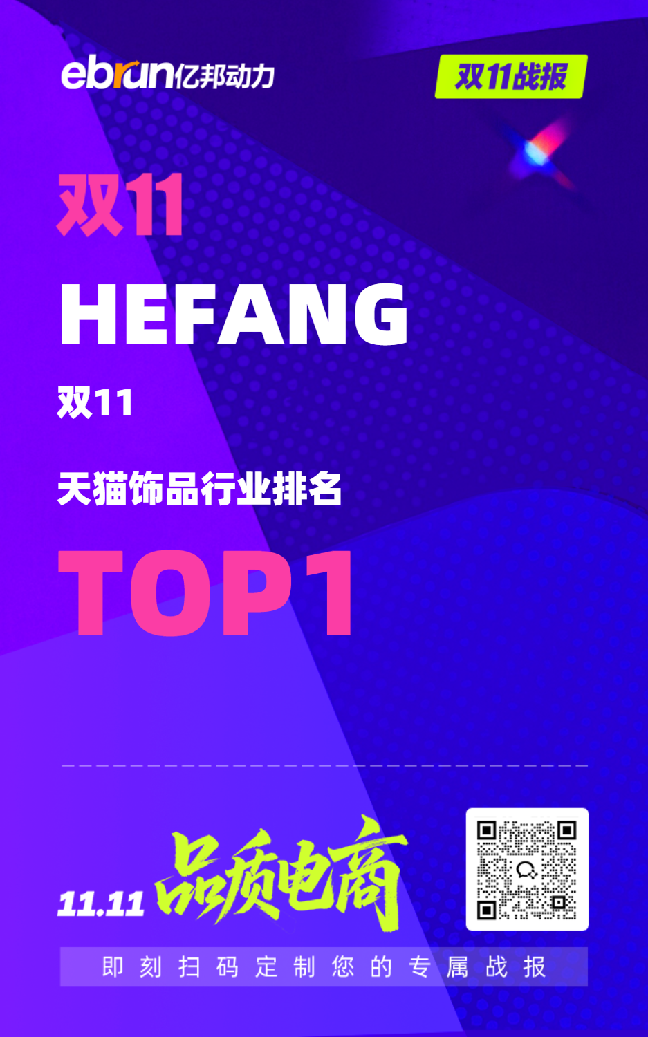 11月17日双11战报消息,HEFANG双11天猫饰品行业排名TOP1。数据统计周期10.9-11.11,数据取自电商各个平台后台数据。