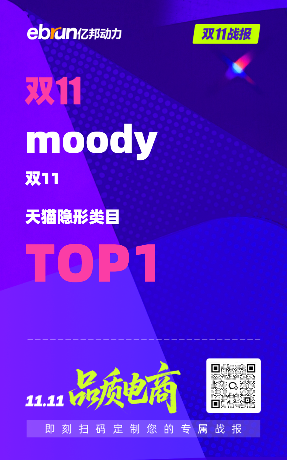 11月18日双11战报消息,moody双11天猫隐形类目TOP1。数据统计周期10.9-11.11,数据取自电商各个平台后台数据。