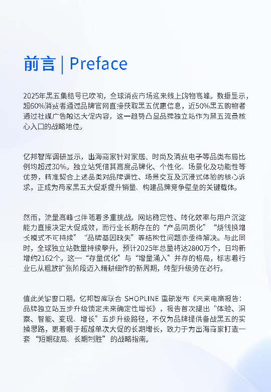 黑五将至,亿邦智库 X SHOPLINE 联合发布《未来电商报告:品牌独立站五步升级锁定未来确定性增长》,不仅为品牌提供应对黑五的实操思路,更着眼于超越单次大促的长期增长,为出海商家打造一套 “短期破局、长期制胜” 的战略指南。